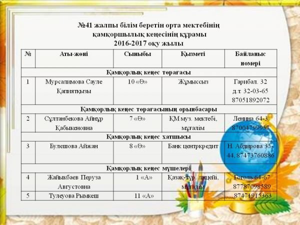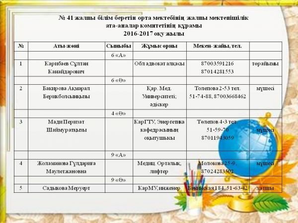 № 41 жалпы білім беретін орта мектебінің жалпы мектепішілік ата-аналар комитетінің құрамы
