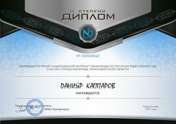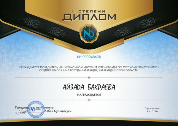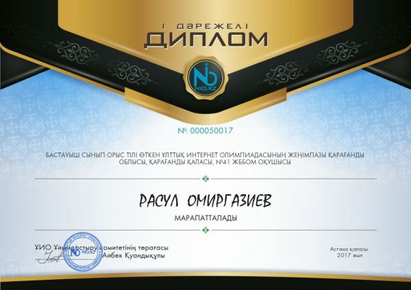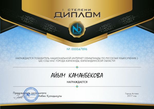 №41 жалпы білім беретін орта мектебінің оқушыларының орыс тілі мен орыс әдебиеті пәнінен Ұлттық қашықтық Интернет Олимпиадасына қатысып, бірінші дәрежелі Дипломмен мара…