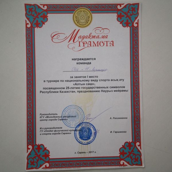 Наурыз мейрамын тойлау кезіндегі "Алтын сақа" ұлттық асық ату спорттық ойынында 1 орын иеленген мектебіміздің командасын құттықтаймыз