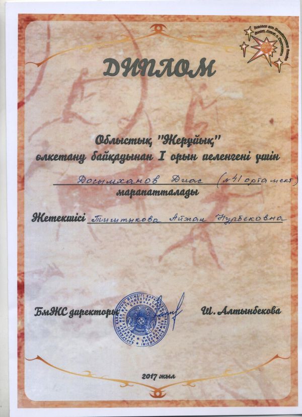 18.01.2017ж. күні Балалар мен Жасөспірімдер сарайында Облыстық "Жерұйық" өлкетану байқауы өтті. Мектебіміздің 9 "Ә" сынып оқушысы Досымханов Диас байқауға қатысып, I орынды…