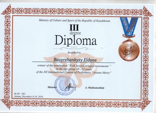 7 "Ә" сынып оқушысы Бауыржанқызы Елдана қобыз аспабымен ойнауда XII Халықаралық байқаудан ІІІ дәрежелі дипломмен марапатталды. ҚҰТТЫҚТАЙМЫЗ!