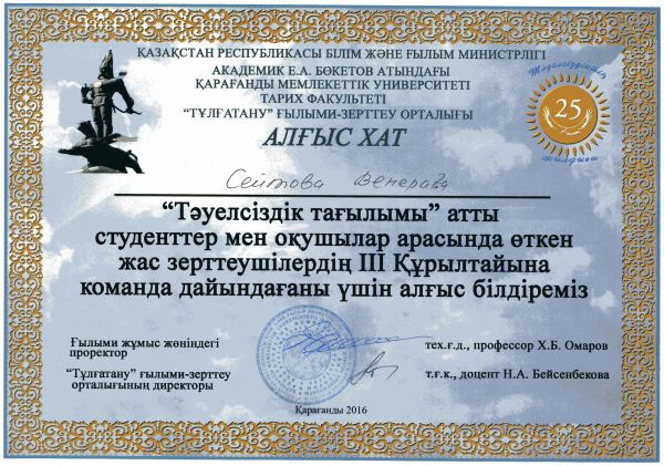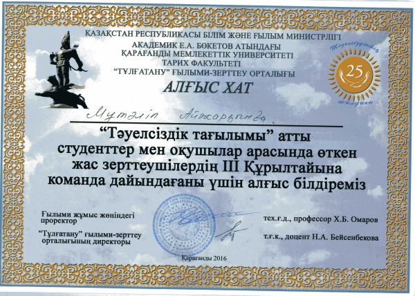Қарағанды Қаласының білім бөлімінің ұйымдастыруымен «Азаттықтың ақ таңы» қалалық ғылыми-тәжірибелік конференциясына белсене араласып, мазмұнды баяндама жасағаны үшін 9 «Ә» сы…