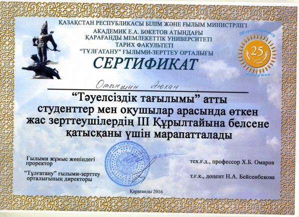 «Тәуелсіздік тағылымы» атты студенттер мен оқушылар арасында өткен жас зерттеушілердің ІІІ Құрылтайында оқушыларды ғылыми-жобаға дайындағаны үшін тарих пәні мұғалімдері: Абдрахмано…