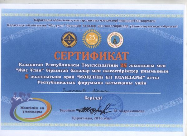 Қазақстан Республикасы Тәуелсіздігіне 25 жылдық мерейтойына орай "ЖЫЛДЫҢ ҮЗДІК 100 МҰҒАЛІМІ" жобасына қатысып, ұсынған озық іс-тәжірибесі "Жылдың үздік сабағы " жинақ…