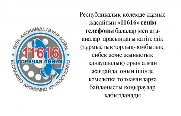 Республикалық көлемде жұмыс жасайтын «11616»сенім телефоны балалар мен ата-аналар арасындағы қатігездік (тұрмыстық зорлық-зомбылық, еңбек және жыныстық қанаушылық) орын алған…