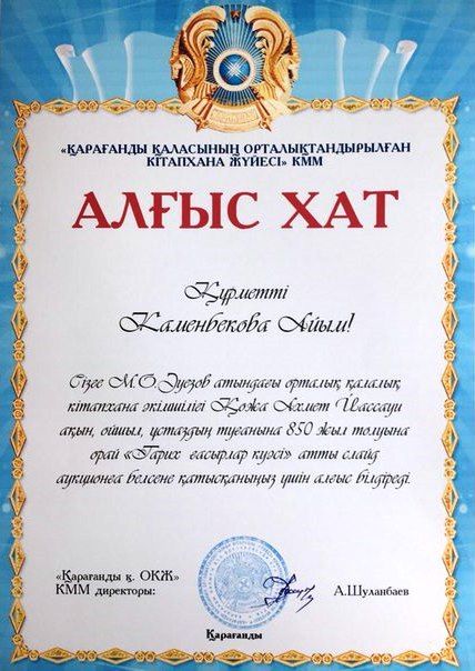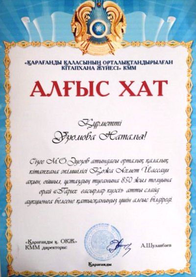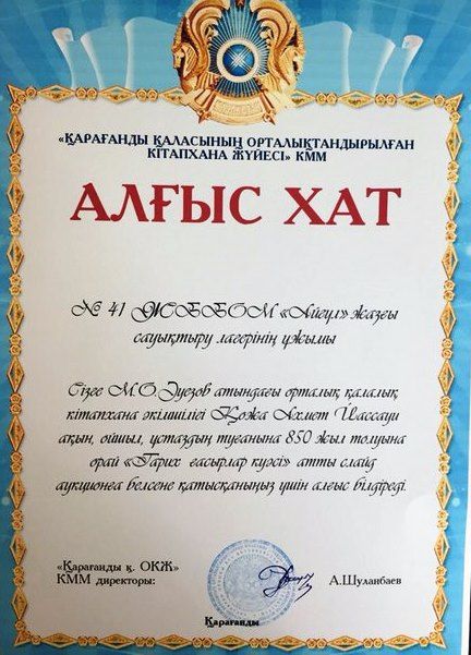 №41 жалпы білім беретін орта мектебі жанындағы "Айгөлек"жазғы сауықтыру лагері мен М.О.Әуезов атындағы орталық қалалық кітапханасымен бірлесе Қожа Ахмет Йассауи ақын, ойшыл, ұстаздың 850 ж…