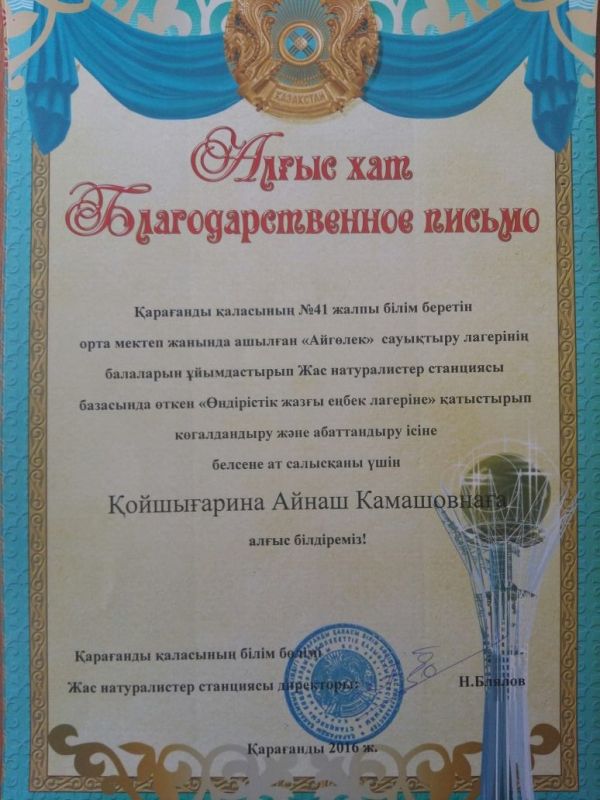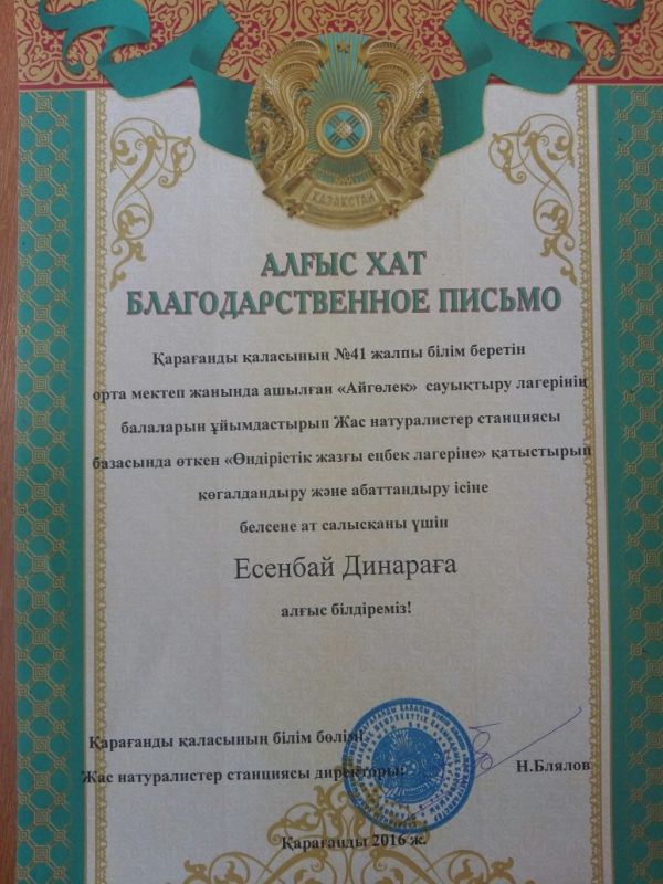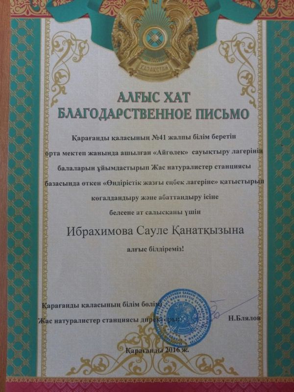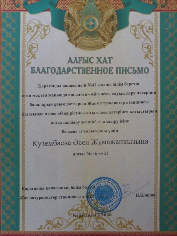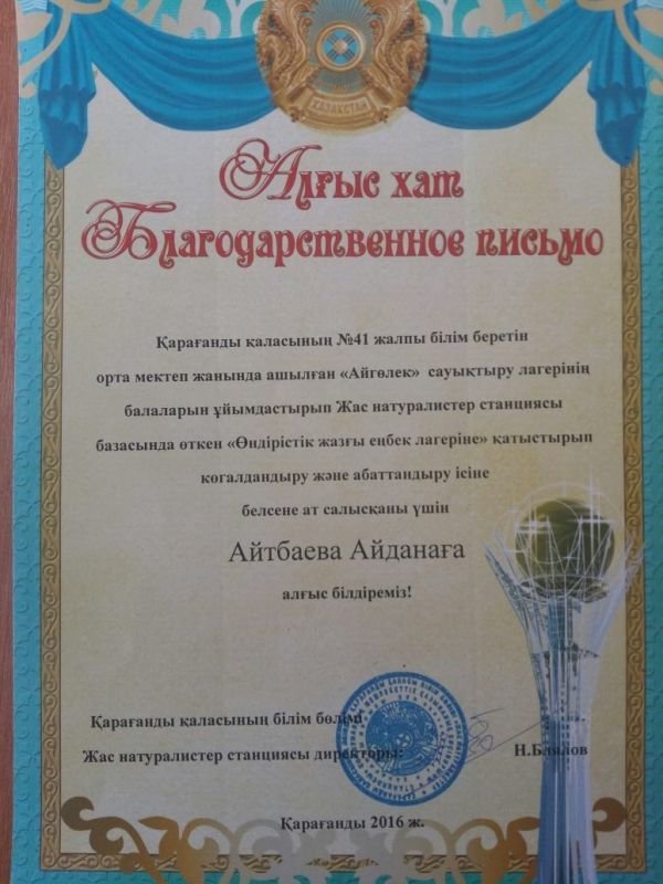 27.06.2016 күні Айгөлек жазғы сауықтыру лагерінің балаларын ұйымдастырып Жас натуралистер станциясы базасында өткен "Өндірістік жазғы еңбек лагеріне" қатыстырып көгалдандыру жəне абаттандыру ісіне бес…