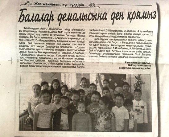 №41 жалпы білім беретін орта мектебі жанындағы "Айгөлек" жазғы сауықтыру орталығының көңілді демалушылары "Орталық Қазақстан" басылымында