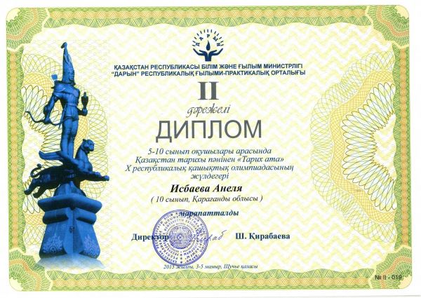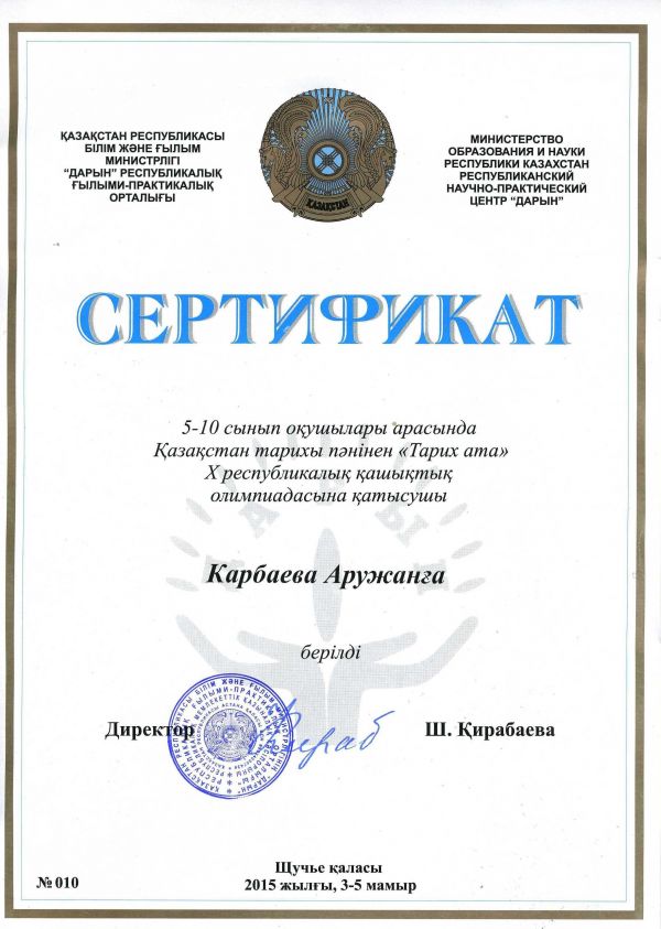 2015 жылы 3-5 мамыр күні Щучье қаласында өткен Қазақстан тарихы пәнінен «Тарих ата» Х республикалық олимпиадасына мектебіміздің оқушылары Карбаева Аружан, Исбаева Анеля, Базилов Айд…