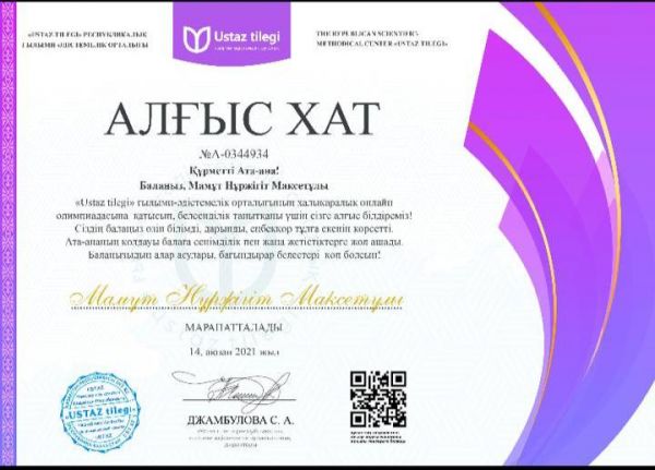 Математика пәнінен оқушылар арасында өткен қашықтық олимпиадасының жүлдегері 4 "Ә" сынып оқушысы Мамұт Нұржігіт Максетұлы III дәрежелі дипломмен марапатталды. Құттықтаймыз! Сынып жетекшісі Д.М.Какен…