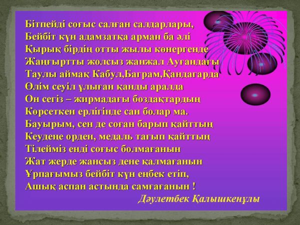 "Ауғанның асуында от кешкендер" тақырыбында 4 "Ә" сыныбында тәрбие сағаты өтті. Мақсаты: Ауған соғысы жайлы мағлұмат беру. Тәуелсіздік жолында күрескен жауынгер ағалар ерлігін үлгі ете отырып, ұлтжанд…