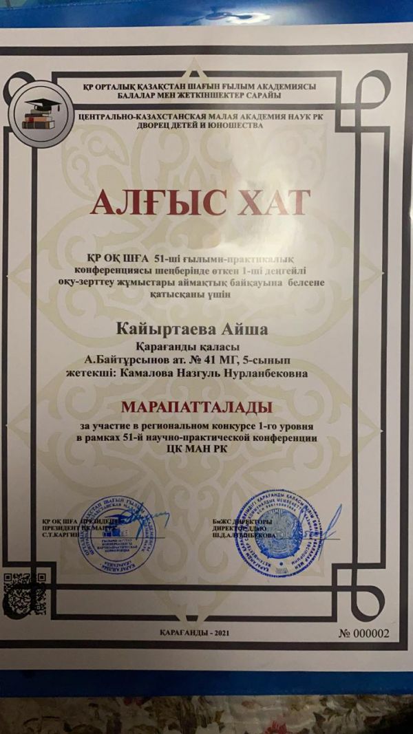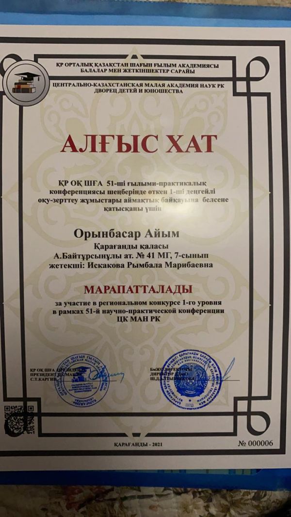 29.01.2021ж. ОҚ ШҒА 51-ші ғылыми - практикалық конференциясы шеңберінде өткен 1-ші деңгейлі оқу-зерттеу жұмыстарының аймақтық байқауында үздік оқу-зерттеу жұмыстары үшін марапатталды