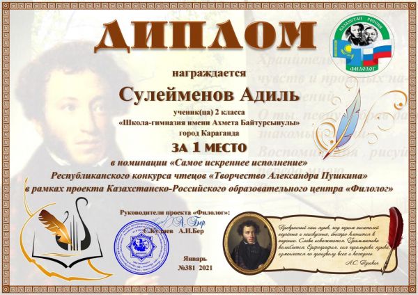 Поздравляем призёров Республиканского конкурса чтецов «Творчество Александра Сергеевича Пушкина»