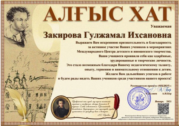 "Ustaz tilegi" ғылыми - әдістемелік орталығы ұйымдастырған Республикалық Математика пәнінен онлайн олимпиадасына 4 "Ә" сынып оқушысы Жұмабек Әлихан қатысып,