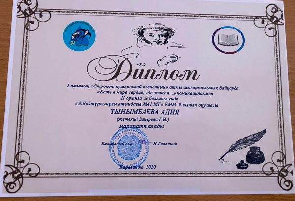 Республикалық "ALTYN QYRAN - ерекше дарын иесі" зияткерлік олимпиадасына 4 "Ә" сынып оқушысы Сағат Әмина қатысып II дәрежелі дипломмен марапатталды. Жетекші мұғалім К…