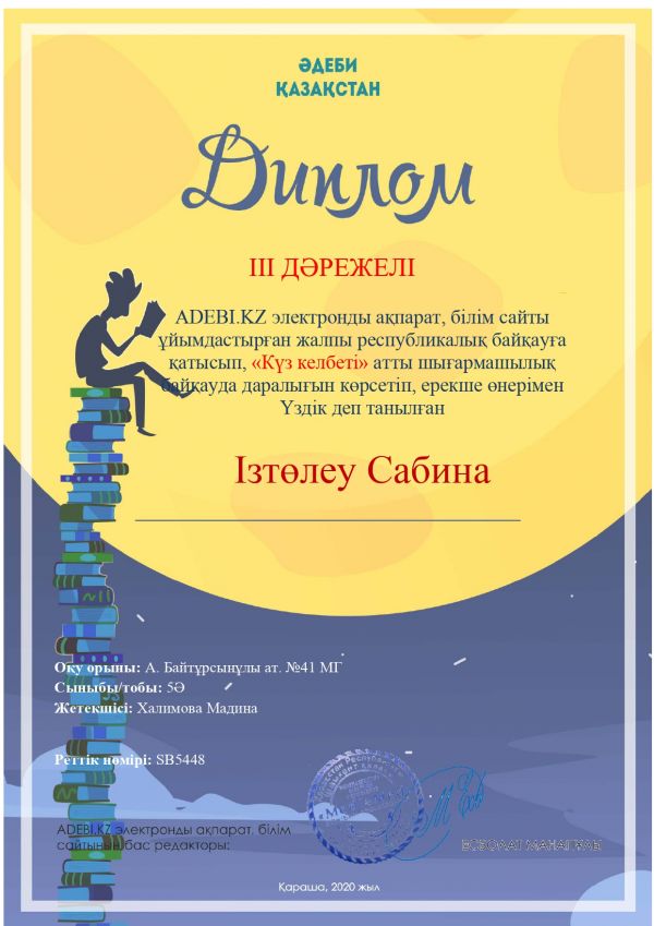 «ADEBI.KZ» интеллектуалды порталы әр ай сайын Республика деңгейінде ұйымдастырылатын кезекті интернет «Күз келбеті» байқауына 5 «Ә» сынып оқушылары қатысып жүлдел…