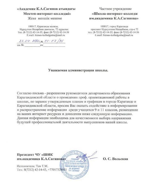 ЧУ «Ш.И.К. имени академика К.А. Сагинова»  (КУБУП) колледж, школа. Объявляет набор в колледжи проводит онлайн тестирование на нашем сайте  по следующим  управленческим спе…
