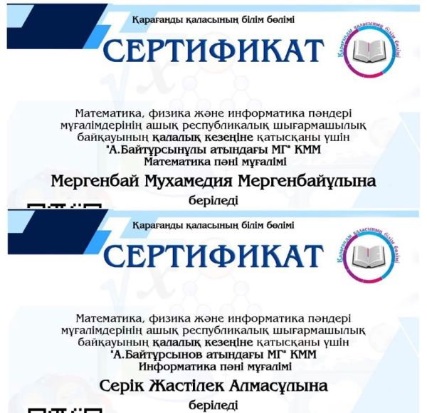 Математика, физика және информатика пәндері мұғалімдерінің ашық республикалық шығармашылық байқауының қалалық кезеңіне қатысқаны үшін сертификат берілді. Құттықтаймыз!!
