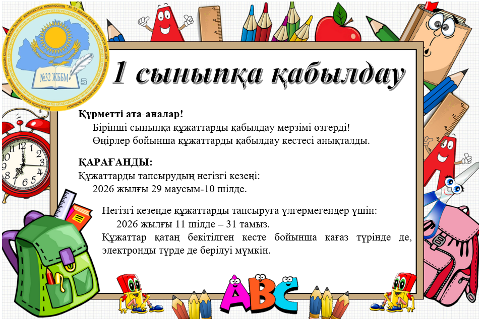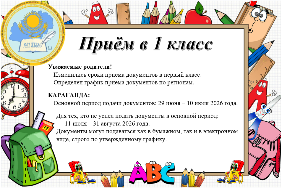 Құрметті ата-аналар! Бірінші сыныпқа құжаттарды қабылдау мерзімі өзгерді! Өңірлер бойынша құжаттарды қабылдау кестесі анықталды. ҚАРАҒАНДЫ: Құжаттарды тапсырудың негізгі кезеңі: 2026 жылғы 29 ма…