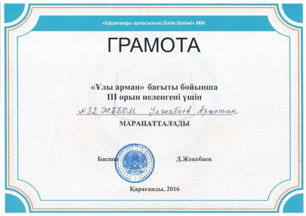Мамырдың 12 жұлдызында  № 57 мектеп  лицеиінде Қарағанды қаласының білім бөлімінің ұйымдастырылуымен ІІІ кезеңде өткізілді. №32 ЖББОМ 9 «Б» сынып оқушысы Улжабаев Арыстан &la…