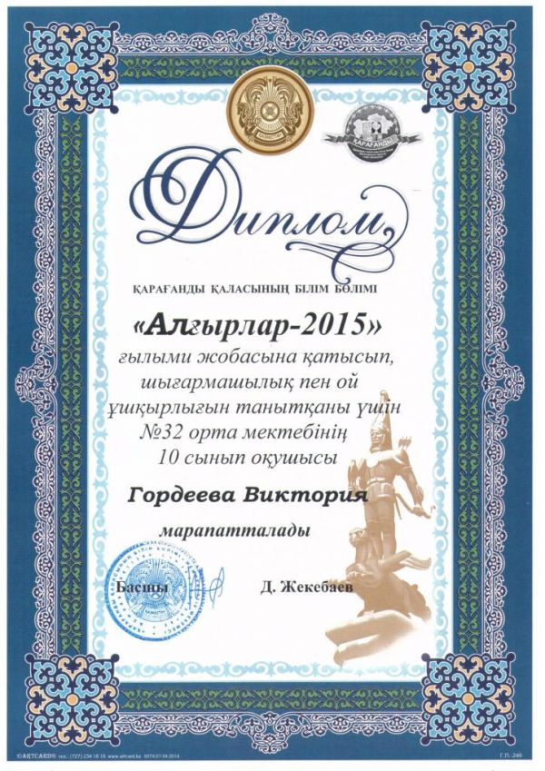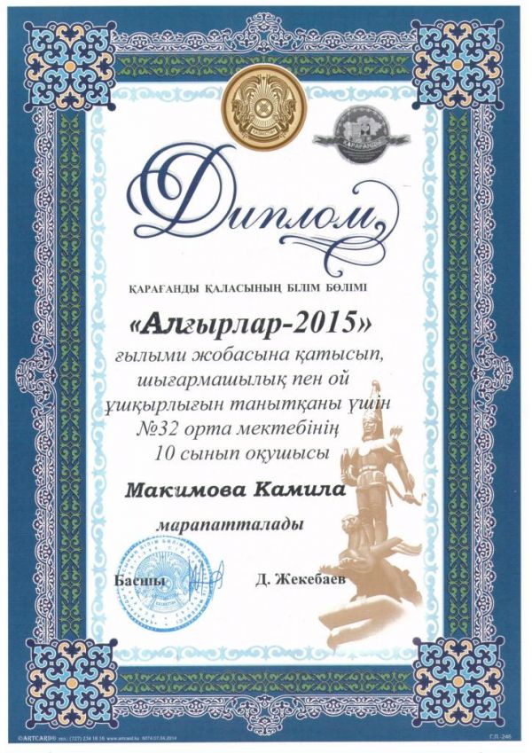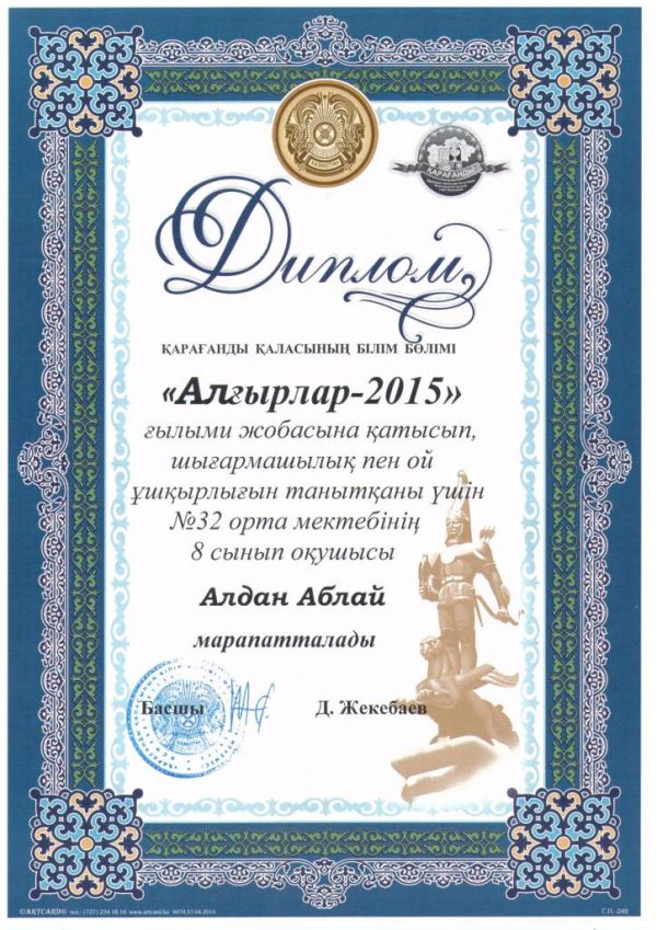 Алдан Аблай (8А класс), Гордеева Виктория (10А класс), Макимова Камила (10А класс) приняли участие в Фестивале проектов "Алғырлар-2015", где представили свой проект по установлению на терр…