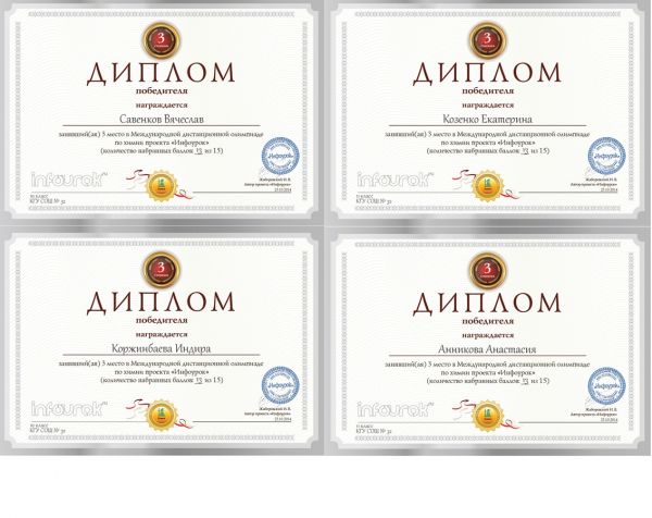 Учащиеся СОШ №32 приняли участие в Международной дистанционной олимпиаде по химии проекта «Инфоурок» и показали следующий результат: I место Сиверина Анастасия  (9А) Гастева В…