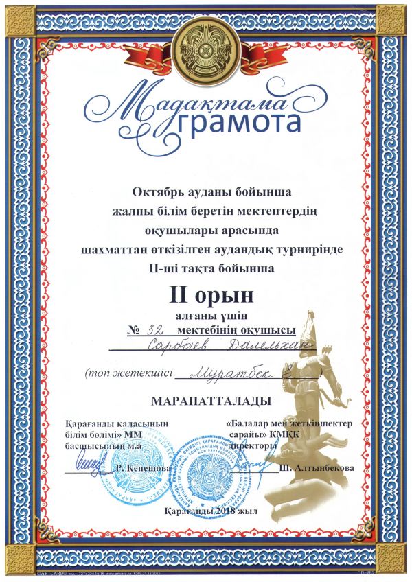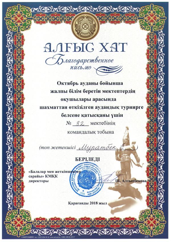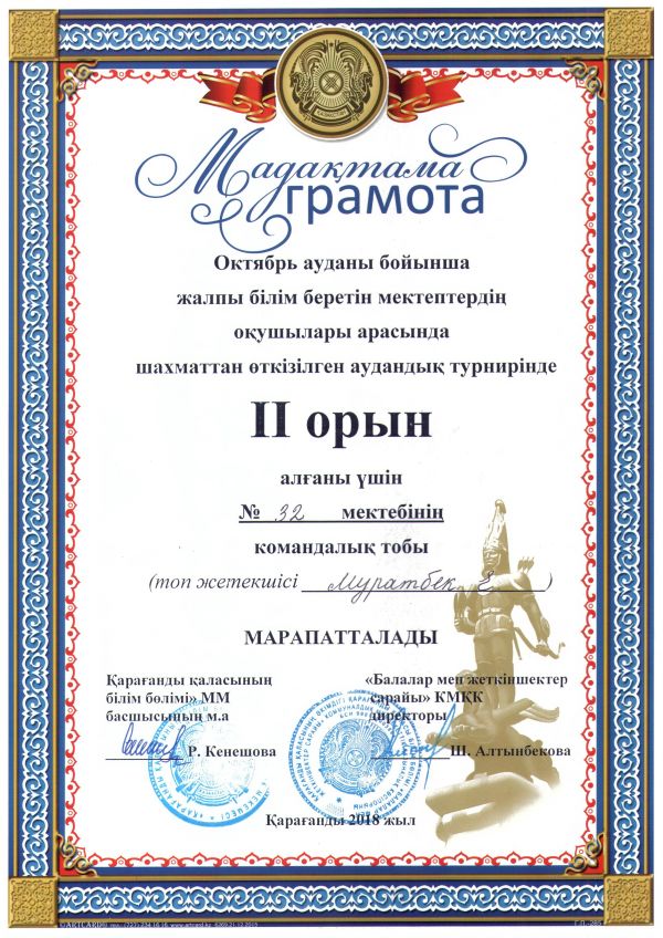 № 32 ЖББОМ оқушылары аудандық шахматтан турнирге қатысу және келесі нәтижелерді көрсетті: