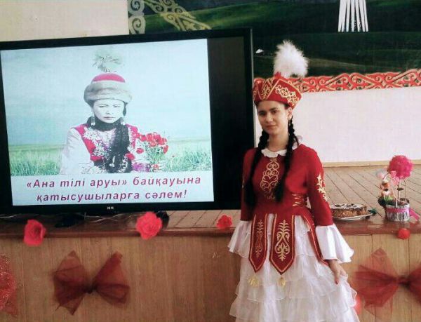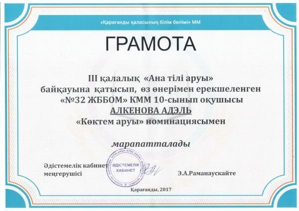 Ученица 10А класса СОШ №32 Алкенова Адэль приняла участие во II городском конкурсе "Мисс родной язык" и награждена грамотой в номинации "Мисс весна". Учитель Скакбаева Ж.С. Поз…