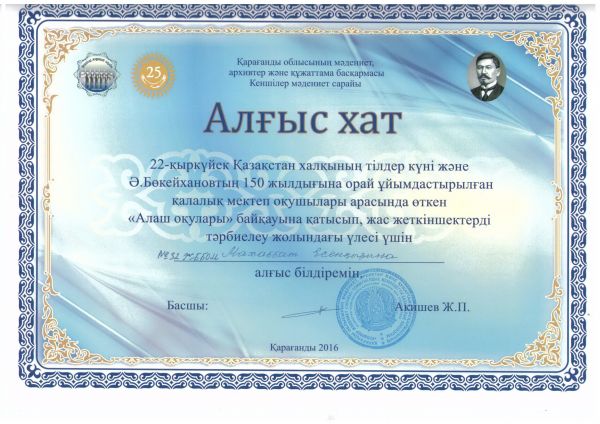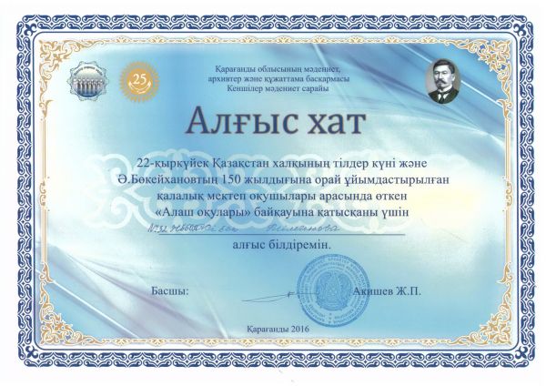 Қарағанды кеншілер мәдениет сарайында 22-қыркүйек тілдер күніне ұйымдастырылған қалалық мектеп оқушылары арасында өткен «Алаш оқулары» байқауында 7 «Ә» сынып оқушысы Тлегенов…