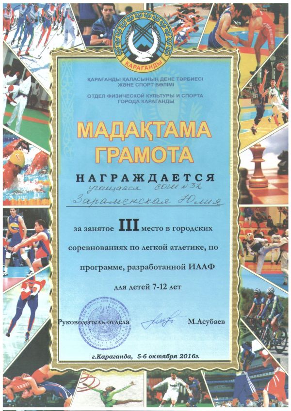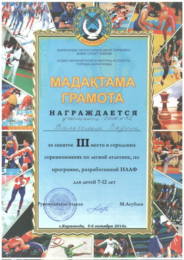 Ученик 4А класса СОШ №32 Муканов Мирас занял III место в открытом Первенстве города Караганды по мини-футболу, посвященного памяти Н.Галиева среди юношей 2006-2007 года рождения.
