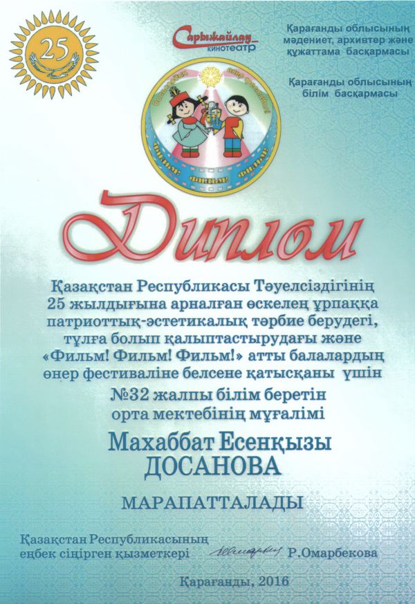 Қарағанды облысының мәдениет архивтер және құжаттама басқармасымен білім басқармасының ұйымдастыруымен өткізілген ҚР Тәуелсіздігінің 25 жылдығына арналған «Фильм! Фильм! Фильм!» атты өне…