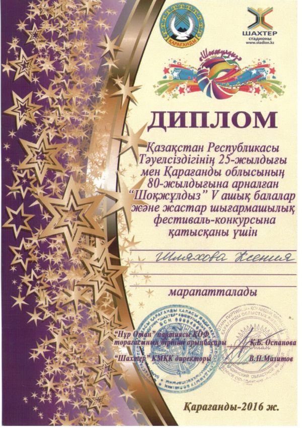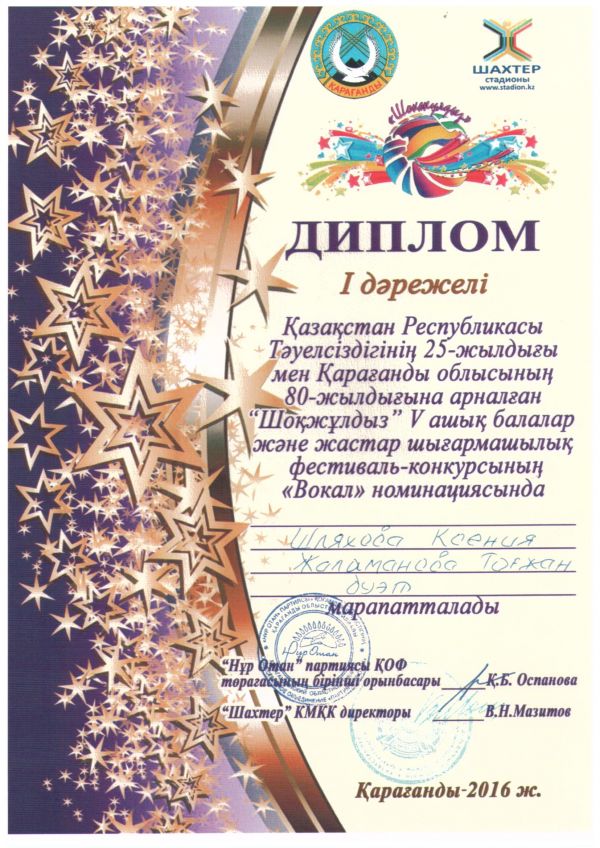 I место в V Открытом творческом фестивале-конкурсе "Шоқжұлдыз"