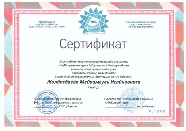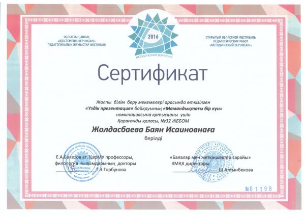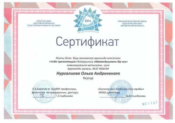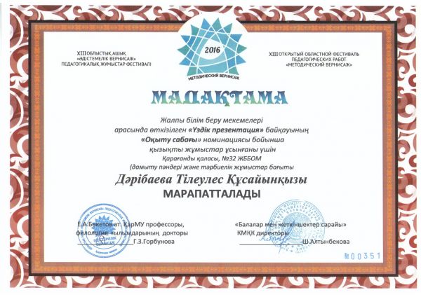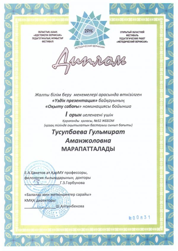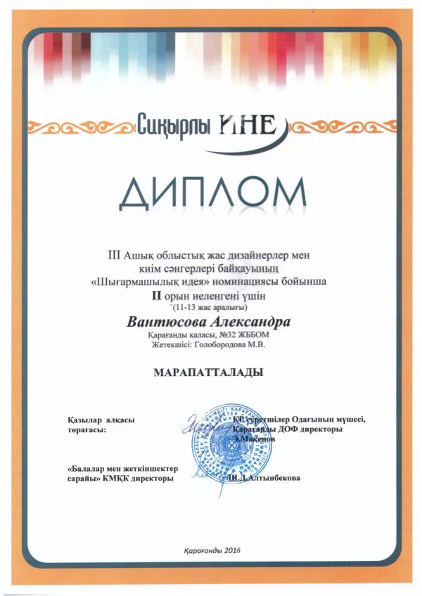 В городском конкурсе «Легенды и мифы Караганды», посвященном Дню города, ученица 5«В» класса СОШ №32 Караваева Мария отмечена грамотой в номинации «Литературное творчес…