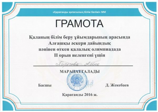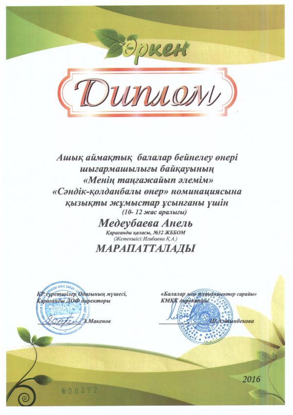 За участие в творческом конкурсе "Мир моей мечты" в номинации "Графика" грамотой награждена ученица 6Ә класса СОШ №32 Медеубаева Анель.