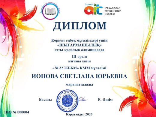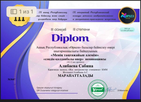 Ашық Республикалық “Өркен“балалар бейнелеу өнері шығармашылығы байқауының “Менің таңғажайып әлемім” ”Сәндік -қолданбалы өнер” номинациясы бойынша 3 дәрежелі дипло…