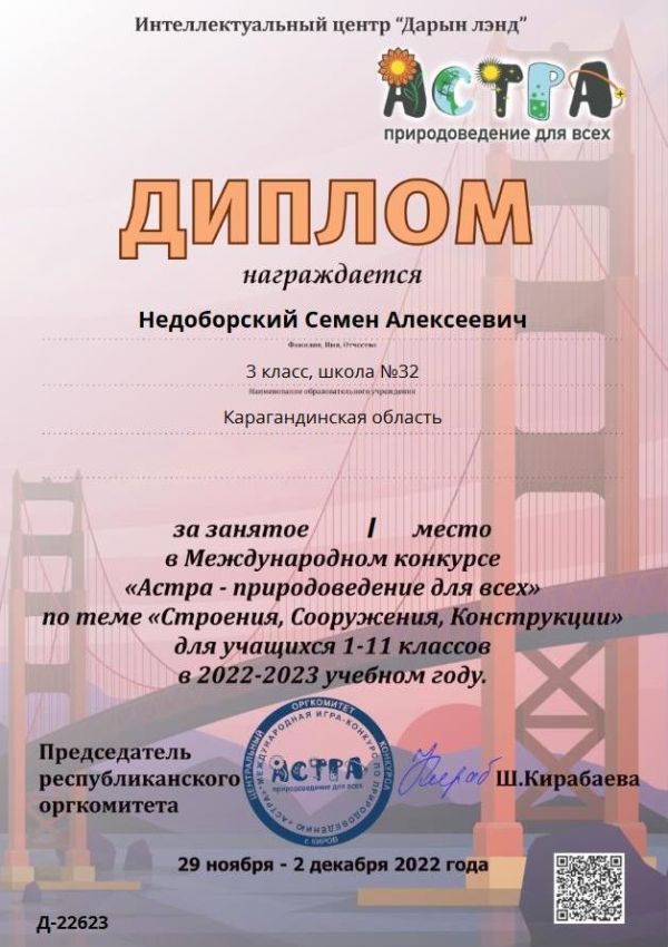Ученик 3 класса «Б» Недоборский Семён занял 1 место в Международном конкурсе «Астра-природоведение для всех» по теме «Строения, Сооружения, Конструкци…