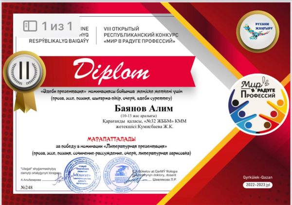 На VIII Открытом республиканском конкурсе" Мир в радуге профессий " дипломом II степени в номинации "Литературная презентация " награжден ученик 4" Б " класса &nb…