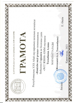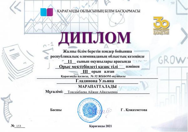 2020-2021 учебном году была проведена олимпиада по 15 дисциплинам. По казахскому языку в олимпиаде приняла участие ученица 11 «А» класса Гладинова Ульяна. В областном туре Р…