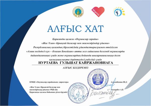 Ученицы 9 класса Мухаметалина Дильназ и Юначевская Мария участвовали в конкурсе по теме "Алаш көгіндегі күн-Әлихан Бөкейхан" и стали победителями конкурса.