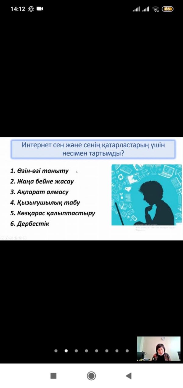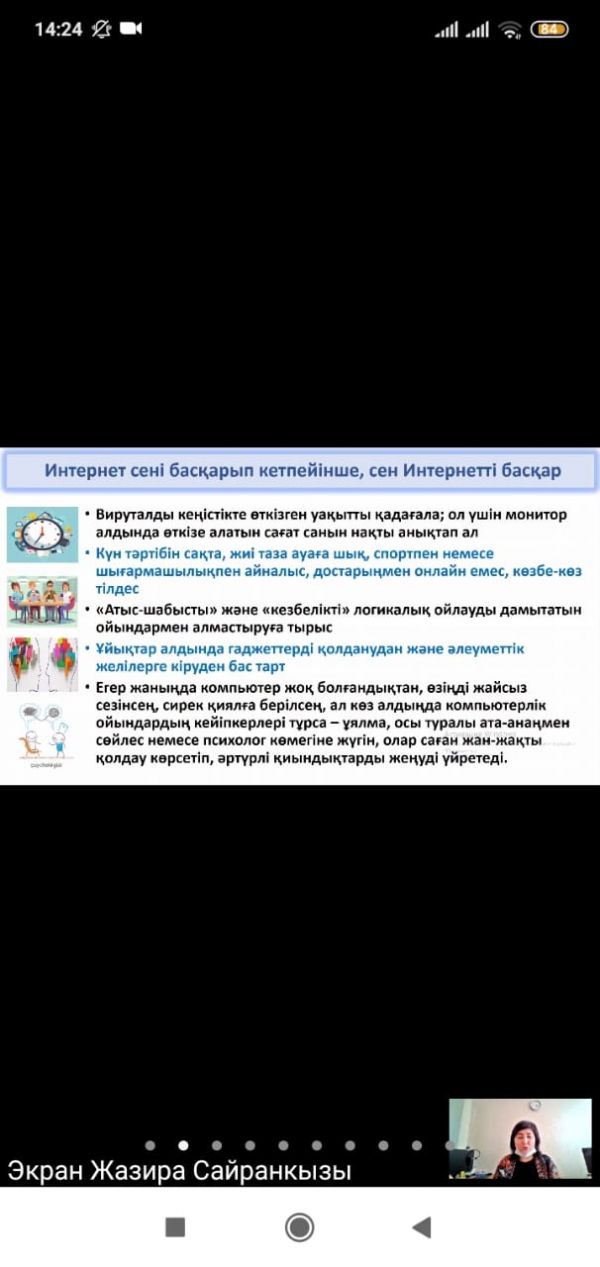 Мектебіміздің 7-8 сыныптардың білімалушыларымен қашықтықтан педагог - психолог Г. М. Кожахметованың ұйымдастыруымен "Ғаламтордағы қауіпсіздік" тақырыбында вебинар өткізіліп, жасөспірімдер…