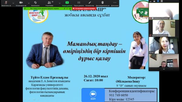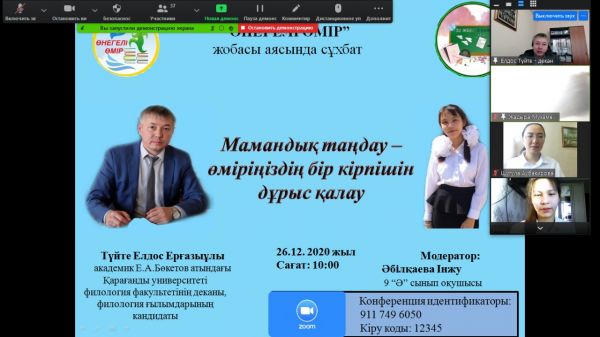 26.12.2020 дылы Қарағанды қаласы №32 ЖББОМ КММ ұйымдастыруымен ЗУММ платформасында "Мамандық таңдау-өміріңіздің кірпішін дұрыс қалау" тақырыбында академик Е.А.Бөкетов атындағы Қарағанды ун…