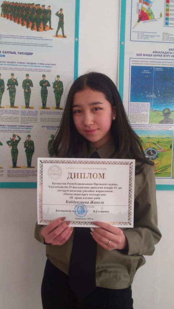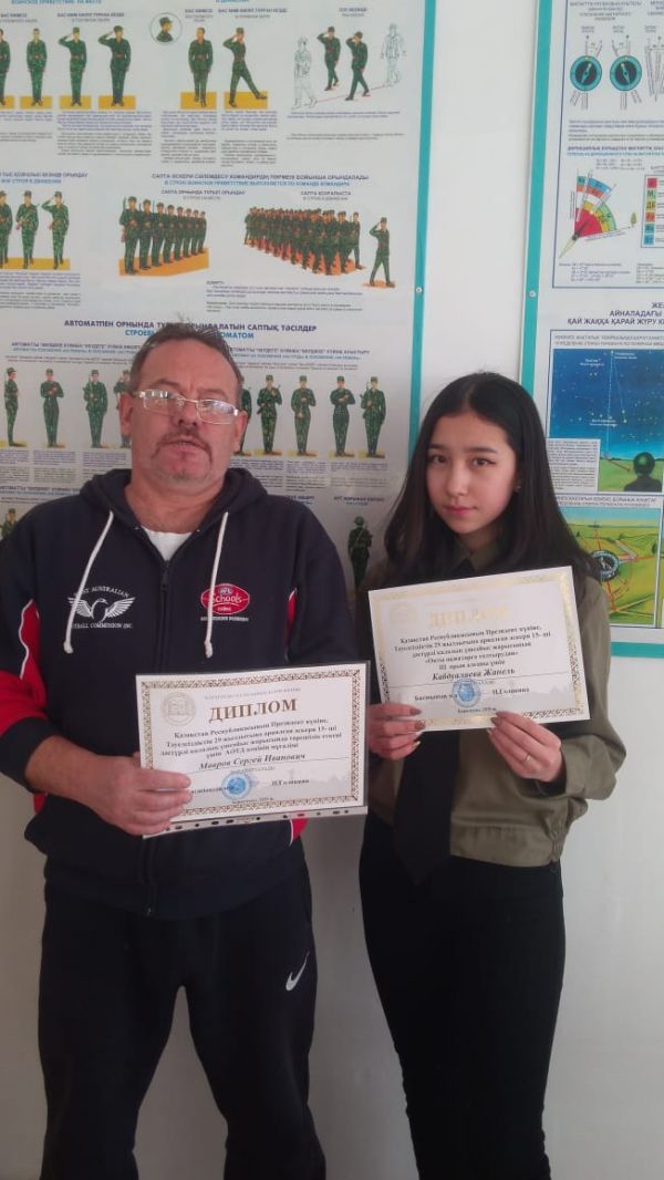 Ученица 11 Ә класса Кабдуалиева Жанель заняла 3 место в соревнованиях по сборке магазина в военном троебории, посвященным Дню Независимости Республики Казахстан. Руководитель: Мавров С.И. Позд…