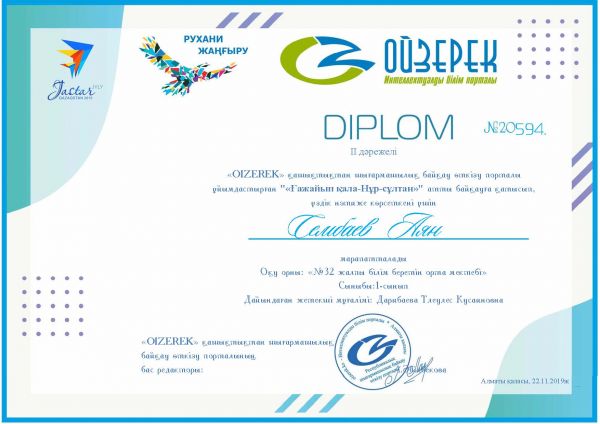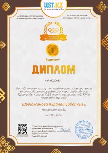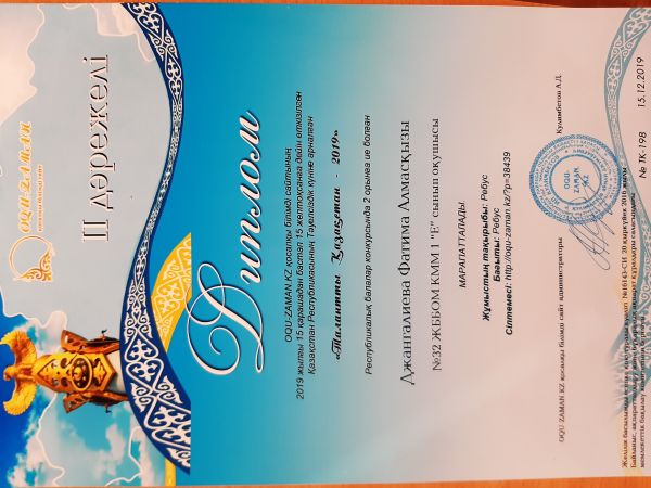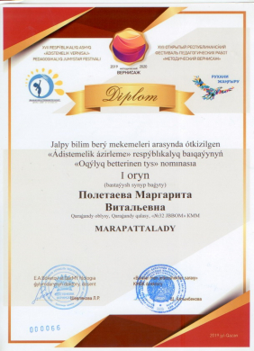 Республикалық «Қазақ тілінде оқытпайтын мектептердегі қазақ тілі мен әдебиеті» Блиц-турнир Диплом 1дәрежелі