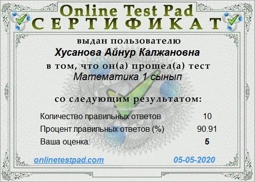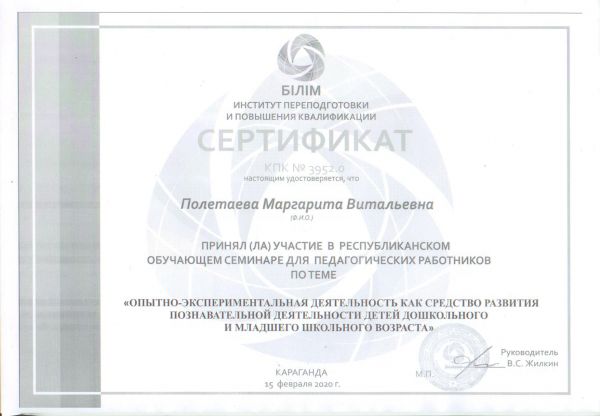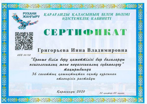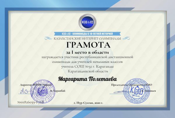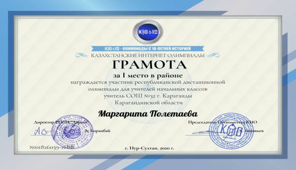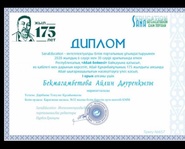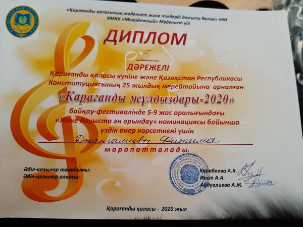 Қарағанды қаласының білім бөлімі ұйымдастырған Ұлы жеңістің 75 жылдығына арналған қашықтықтан өткен " Өнер әлемі" байқауына қатысқаны үшін Жеке орындаушылық номинациясы бойынша Абилдина Гу…