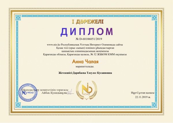 2019-2020 оқу жылында 1Е сынып оқушыларының олимпиадаларға қатысып, жеткен жетістіктері. Жетекшісі: Дәрібаева Т.К.