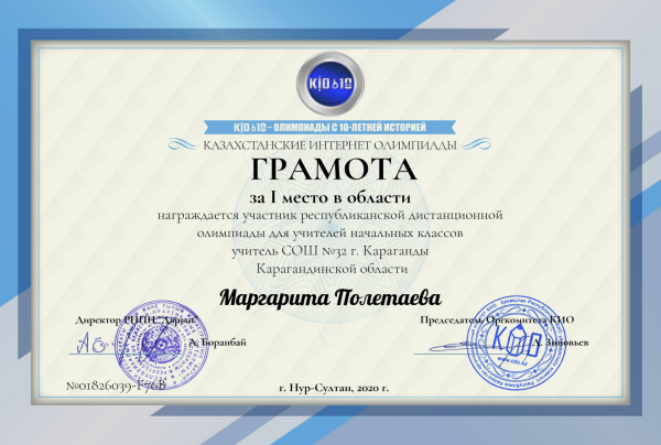 Учитель начальных классов Полетаева Маргарита Витальевна  заняла I место в олимпиаде для учителей КИО.