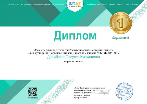 Диплом I степени Бабкина Татьяна Евгеньевна награждена за высокие показатели в республиканской олимпиаде по предмету "начальные классы", организованной обществом "Қазақстан ұстаздары&…