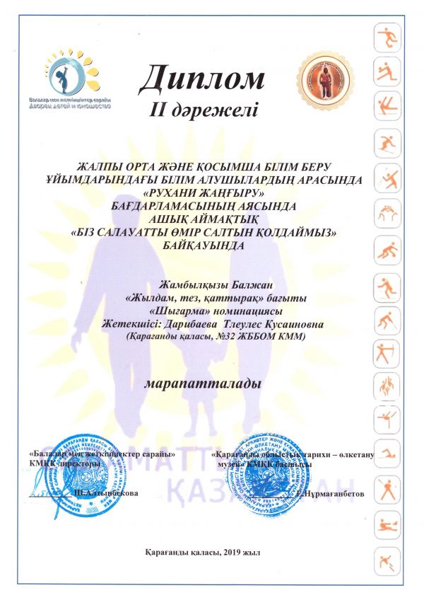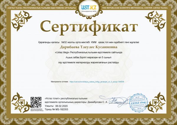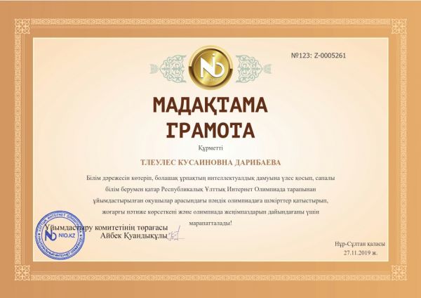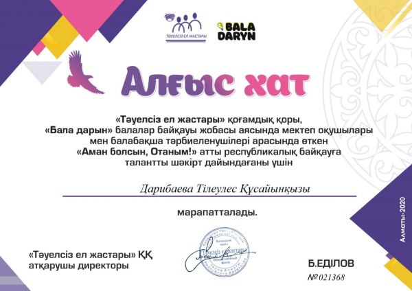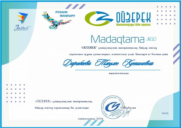 Қазақтың бас ақыны Абай Құнанбайұлының 175 жылдық мерейтойына орай, ақынның шығармашылығын насихаттау мақсатында өткізілген "Абай әлемі" онлайн байқауында үздік нәтиже көрсеткені үшін…