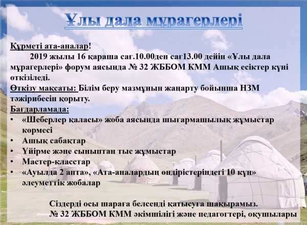 16 ноября в СОШ №32 прошел форум «Ұлы дала мұрагерлері- Наследники Великой степи». Для проведения данного мероприятия были приглашены ветераны педагогического труда, члены попечительског…