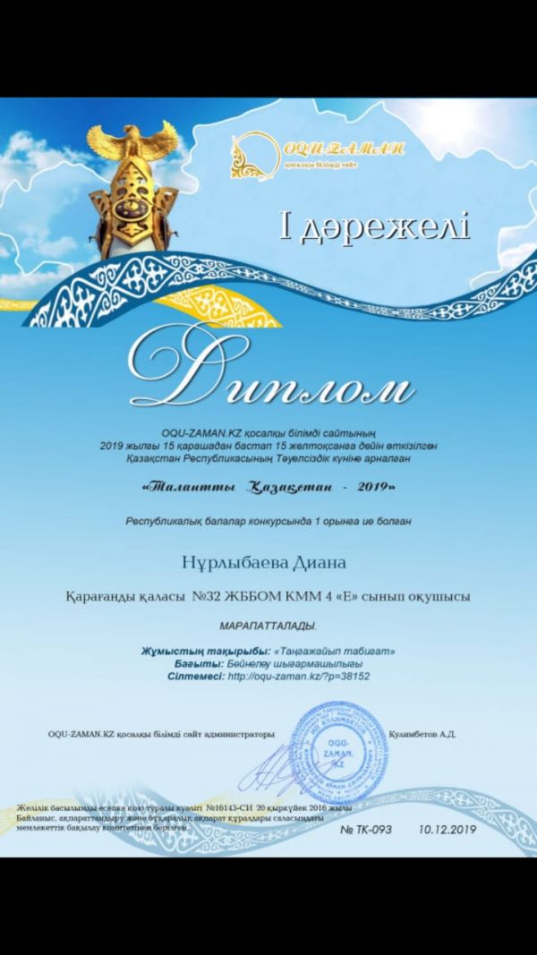 2019жылдың 15 қарашасынан бастап 15 желтоқсанға дейін өткізілген ҚР Тәуелсіздік күніне арналған "Талантты Қазақстан-2019" конкурсына 4 сынып оқушылары белсене қатысып, жүлделі I…